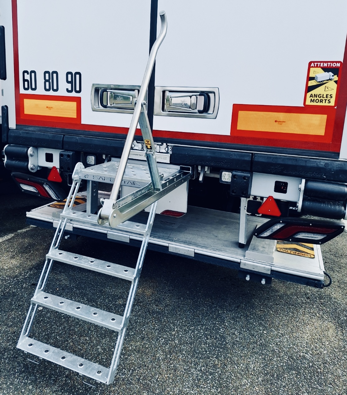 A SafeStair kihúzható lépcsőrendszer a hűtőfelépítmények és félpótkocsik hasznos kiegészítőjeként szolgálhatja a fel- és leszállás biztonságát. Megcsúszásgátló alumínium felületei és automatikus korlátmechanizmusával zord időjárási viszonyok közepette is hatékonyan előzheti meg az el-, illetve leesést.