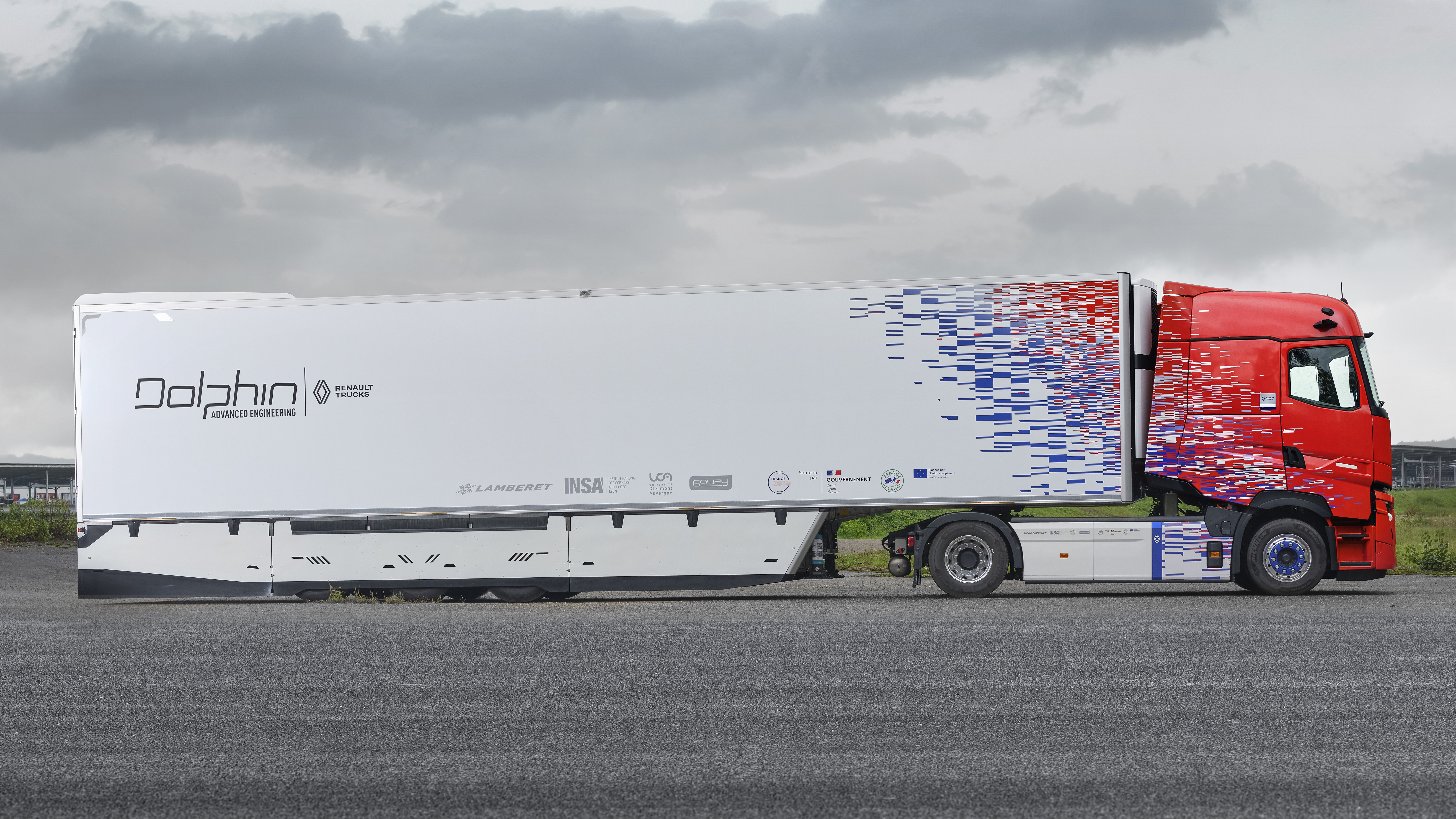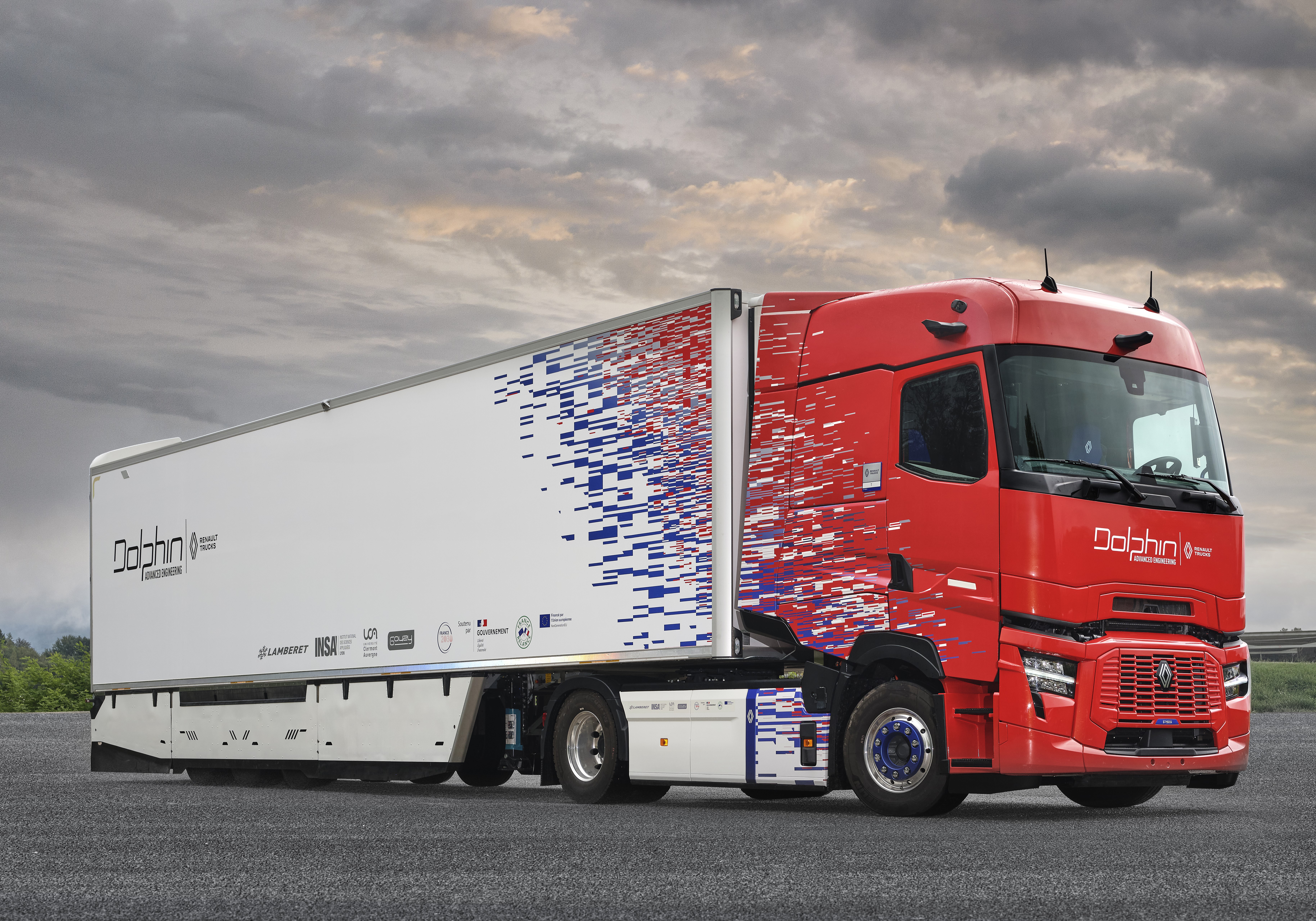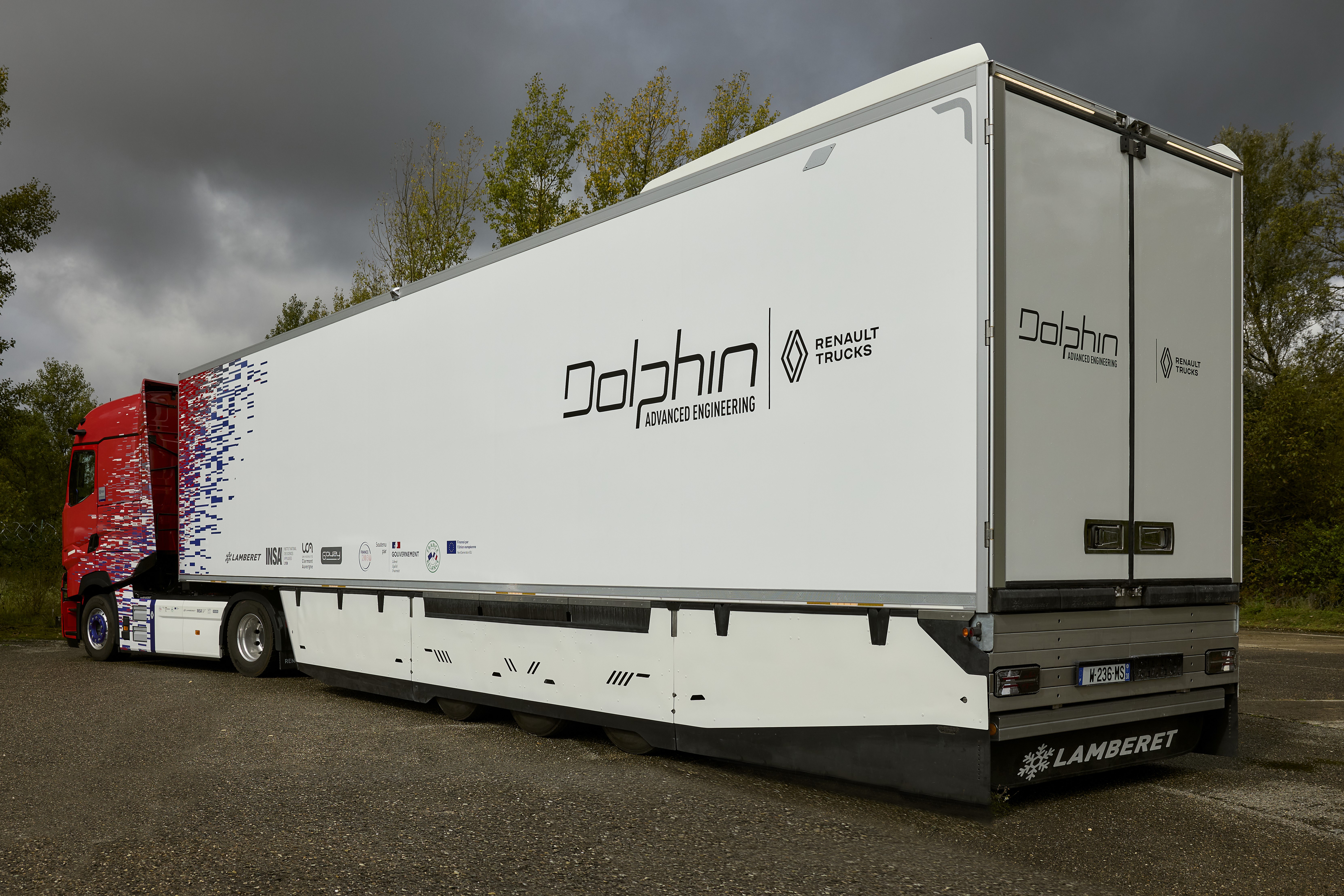 A Lamberet standján tűnt fel a Renault Trucks szervezte DOLPHIN kutatás-fejlesztési program bemutatószerelvénye. A vezető kutatási és iparági partnerek konzorciumának célkitűzése egyszerű, ám annál ambiciózusabb. Olyan tisztán elektromos nyerges szerelvényről van szó, amelynek energiaforgalma, aerodinamikája, biztonsága és ergonómiája – egymást kölcsönösen erősítve – egyetlen közös rendszert alkot. A Lyonban bemutatott referenciajárművet egy Renault T 4×2 elektromos nyerges vontató és egy ugyancsak elektromos Lamberet félpótkocsi alkotta. A hűtőberendezést a vontató elektromos mellékhajtása (ePTO) táplálja. A pótkocsi nagyfeszültségű akkumulátorcsomaggal, elektromos tengellyel és olyan saját fejlesztésű áramátalakítóval (AC/DC-DC/AC konverter) készült, amely valós időben osztja el a rendelkezésre álló energiát a hajtás és a hűtés között. Ez a szerelvényszintű megközelítés korántsem korlátozódik csupán egyes komponensekre, hanem a tényleges alkalmazási profilnak – városi, regionális vagy távolsági szállítás – megfelelően szabályozza az energiaáramlásokat. Az eredmény pedig a hűtőrendszer már a legjobb dízel-referenciaértékekkel összevethető birtoklási költségszintje – mégpedig a hatótáv kárára kötött kompromisszumok nélkül.